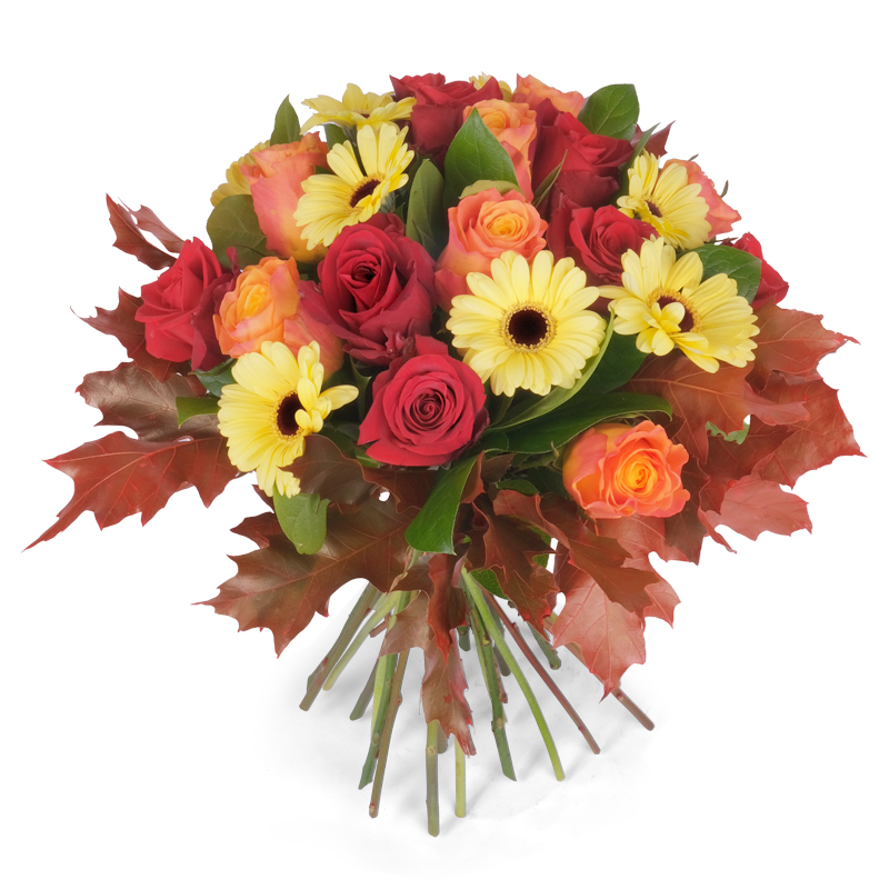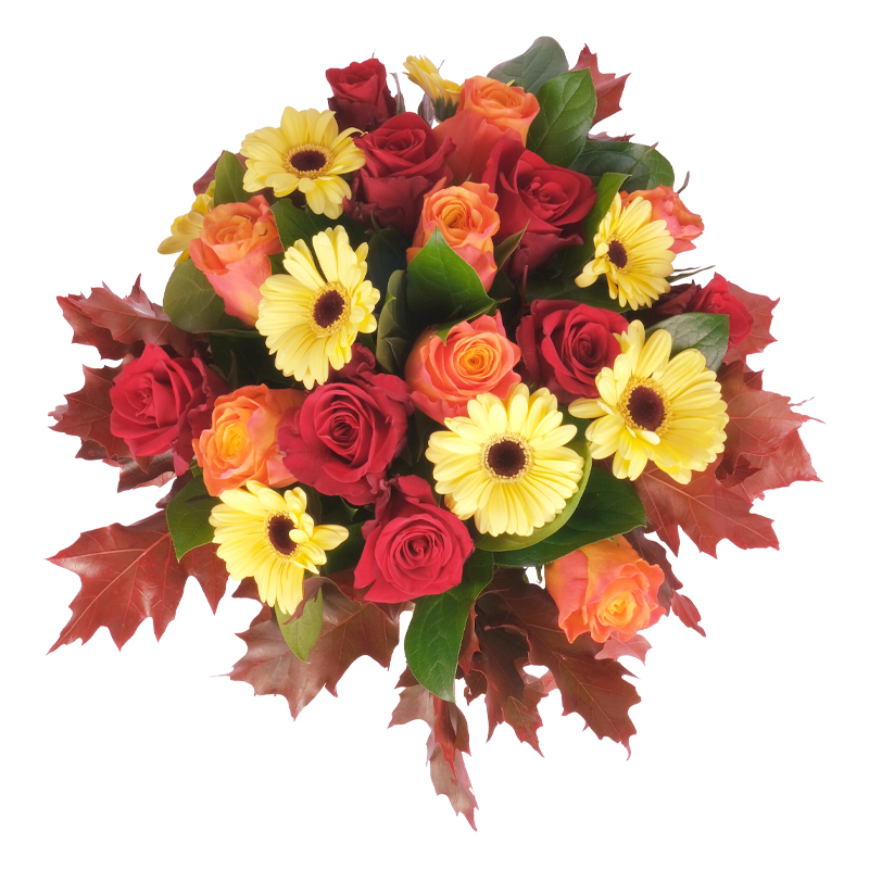 Ten bukiet emanuje przytulnym urokiem i naturalną elegancją. „Obfita Jesień” to kompozycja róż i gerber, dopełniona liśćmi klonu. Doskonała na każdą okazję – od święta po codzienny gest. Wprowadza do wnętrza harmonię i ciepło.