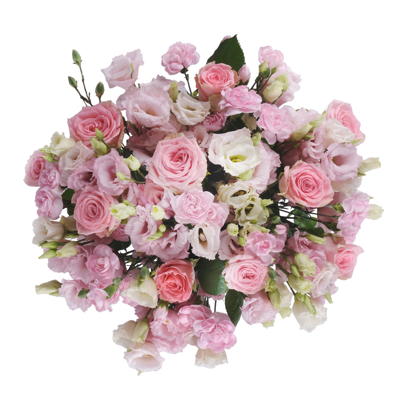 Bukiet pełen czułości – „Połączenie idealne” złożone z różowych róż, subtelnych eustom i delikatnych goździków. Wzruszająca całość z bilecikiem będzie mówić sercem.